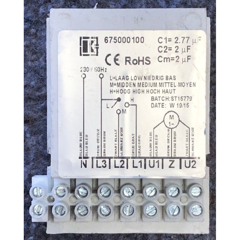 Goede gebruikte condensatorblok voor ventilatiemotor Stork CMF 14 ventilatiebox.
