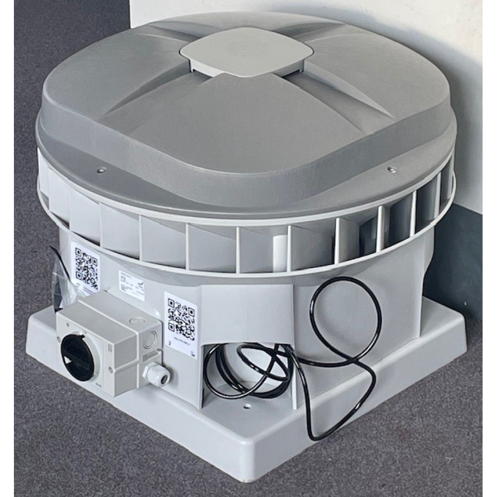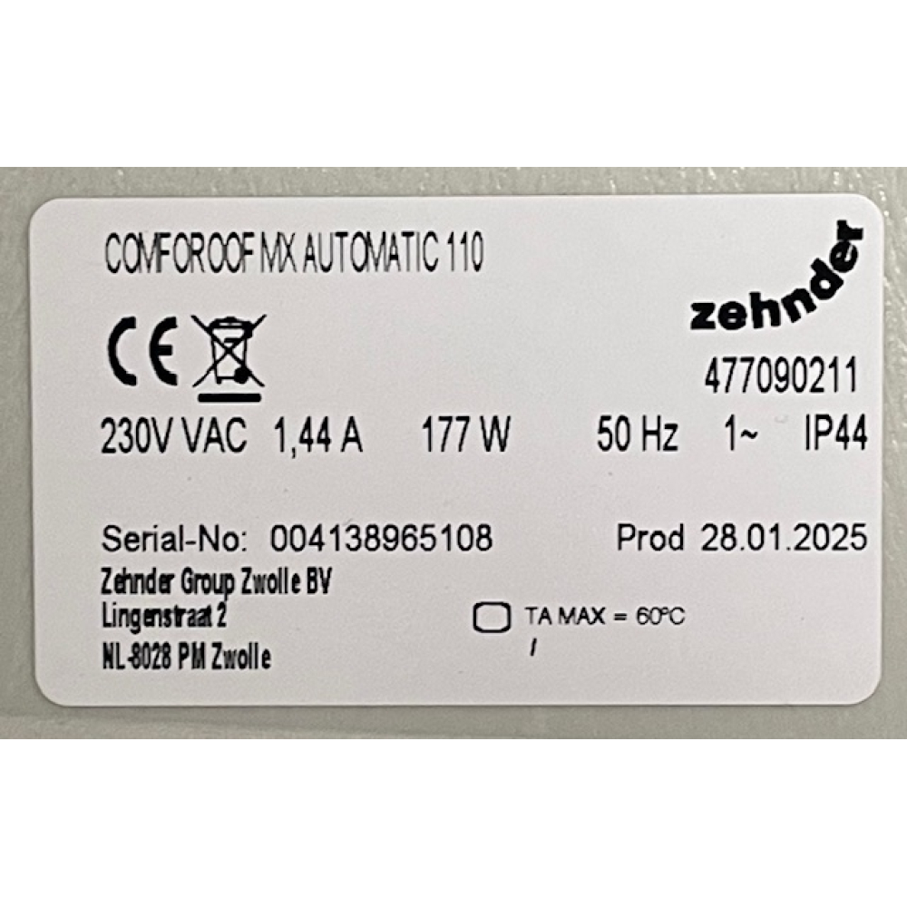 Nieuwe Zehnder ComfoRoof MX Automatic 110 dakventilator met werkschakelaar.