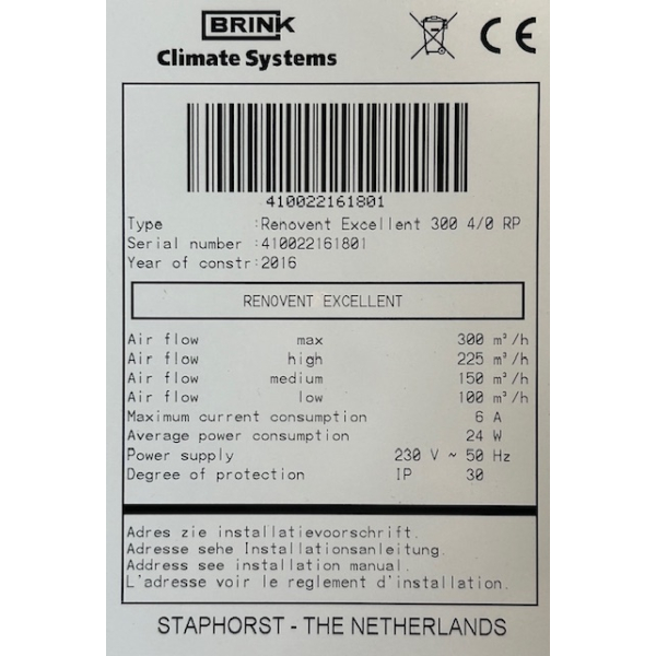 Gereviseerde Brink Renovent Excellent 300 4/0 L met normale stekker en afstandsbediending..